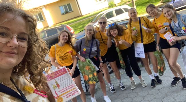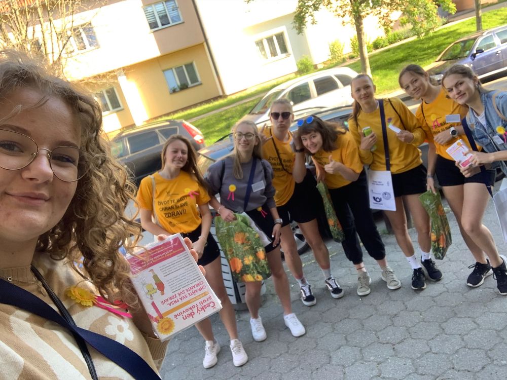 Ve středu 15. 5. 2024 se 16 dobrovolníků ze třídy kvinta vydalo do ulic Humpolce, aby společně pomohli dobré věci. Konal se tradiční Český den proti rakovině, jehož součástí je nejen prodej kytiček měsíčku lékařského, ale také šíření informací týkajících se prevence nádorových onemocnění. V letošním ročníku byla osvětová kampaň zaměřena na screeningová vyšetření prsů a možnost včasného odhalení karcinomu. Díky našim dobrovolníkům bylo prodáno 900 kvítků a vybráno více než 27 000 Kč. Děkujeme.
