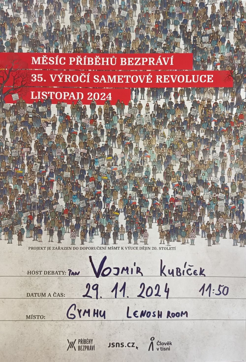 Jako už tradičně se naše škola zapojuje do projektu Jeden svět na školách. Připomínáme si důležité milníky roku 1989 a přerodu naší země. Tentokrát bude možné v rámci projektu zhlédnout dokumentární film Karla Strachoty 1989: Z dopisů psaných přes železnou oponu (2019, 44 min). Blíže se tak podíváme na problematiku exilu a rozdělení rodin. Studenti dějepisného semináře a další zájemci pak budou mít možnost o filmu i době debatovat s naším hostem. Jsme moc rádi, že pozvání na besedu přijal pan Vojmír Kubíček, protagonista roku 1989 na Humpolecku. Kdo nebude moci zajít na besedu, může využít také odkaz Paměti národa k jeho vzpomínkám (https://www.pametnaroda.cz/cs/kubicek-vojmir-1963).