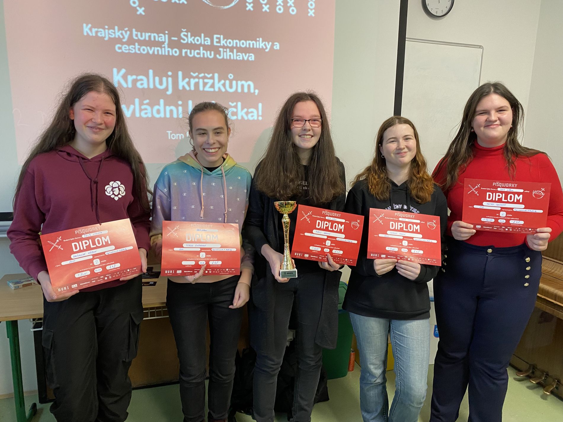 Ve čtvrtek 24. listopadu vyrazil náš tým ve složení Petra Bečková, Tereza Štěpánková, Radka Váchová, Tereza Rusová a Magdalena Křížová jako postupující tým z okresního kola turnaje v pIšQworkách do Jihlavy, aby se utkal s těmi nejlepšími - tentokrát v krajském kole. Ve velké konkurenci čtrnácti týmů si nakonec náš tým odnesl krásné 2. místo.