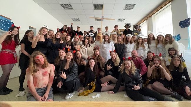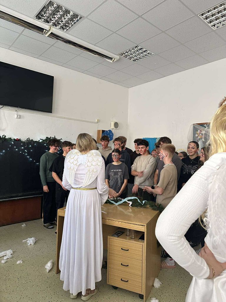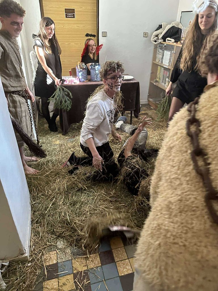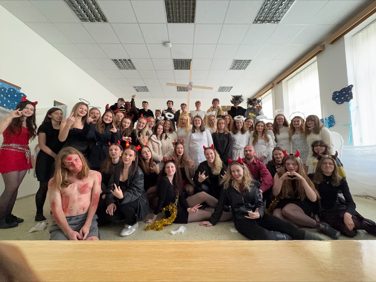 Studenty všech tříd jsme nejdříve odvlekli do pekla, kde okusili hrůzu, která je čeká, pokud budou dále zlobit. Na očích totiž měli spoutaného nešťastníka zmítaného Luciferovými násilnými choutkami. Největší hříšníci byli donuceni k hrůzostrašným úkolům, jako například ke zpěvu a tanci nebo k zapití svých hříchů citronovou šťávou.