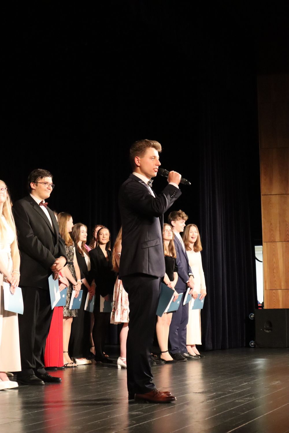 V sále panovala slavnostní atmosféra, kterou dotvářela přítomnost pana ředitele, třídních učitelů, paní zástupkyně, dalších kolegů z pedagogického sboru, a především rodičů, prarodičů a kamarádů maturantů. Nechyběly radostné úsměvy, dojetí ani hrdost – bylo vidět, že za každým vysvědčením stojí velké úsilí, píle a odhodlání.