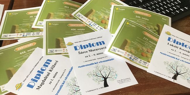 Sklizeň pokračuje také v soutěži Pangea – Pavel Trtík je v kraji 8. a Lukáš Kozojed má stříbro s postupem do celostátního kola. Majda Křížová je v kraji zlatá (v republice zatím 9.) a také postupuje. Výborně si vedla i Ema Kavříková (4.), Terka Kopecká (7.), Terka Honzlová a František Boháč (8.).