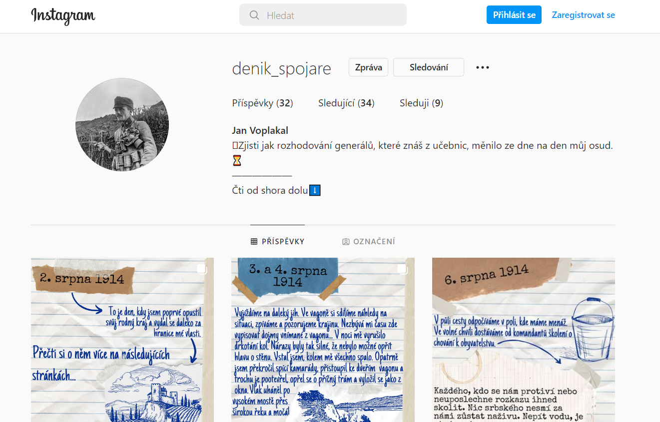 Studenti vytvořili dva týmy, které odlišnými způsoby zpracovávaly zajímavé příběhy našich legionářů za první světové války. První tým ve složení Adéla Vidovičová, Veronika Prokůpková a Jan Pohan vypracoval v rámci soutěže Instagramový účet, na kterém zveřejňovali zážitky a obrázky vojáka tak, jak si je nastudovali z dobových pramenů. Výsledky jejich práce si ostatně můžete prohlédnout na následujícím odkazu (https://www.instagram.com/denik_spojare/). Druhá soutěžící byla pak Marie Šarfová, která se rozhodla podle dobových pramenů a rodinných vzpomínek rekonstruovat cestu svého prapředka. „Ten v mládí vstoupil do armády a bojoval společně s mnoha dalšími československými legionáři v Rusku za první světové války. Dílo sleduje jeho cestu touto nelehkou dobou, popisuje jeho myšlenky, pocity a chování ve válce, která otřásla světem…“ charakterizovala autorka. Vše zpracovala formou poutavé historické novely, která měla dle zadání soutěže přesáhnout rozsah 80 stran. Tento náročný úkol zvládla soutěžící skvěle.