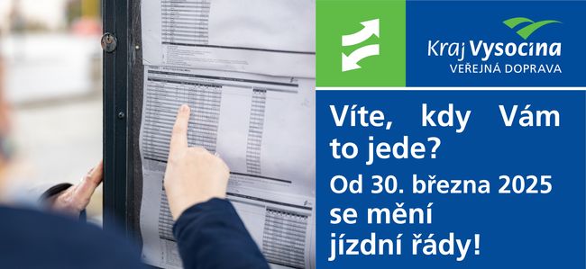 Od 30. 3. 2025 se změní jízdní řády na Jihlavsku a změna se dotkne i dalších obcí - prohlédněte si jejich seznam.